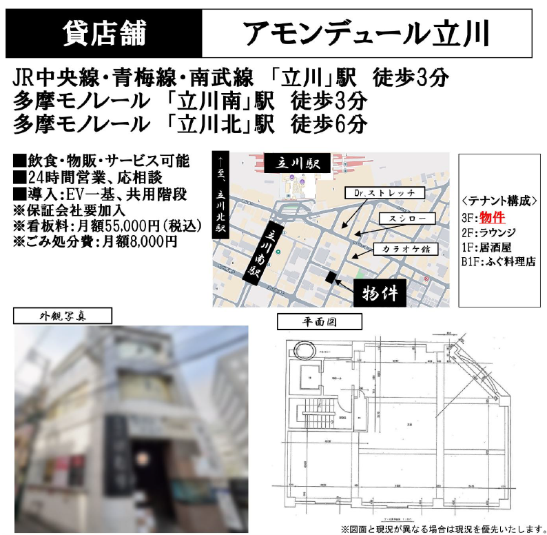 | 備考 | 造作費:相談 看板料:55,000円 月額 ゴミ処理費:8,000円 月額 |